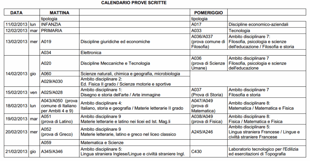 I test si terranno dall’11 al 21 febbraio 2013 e saranno suddivisi per classi di concorso (si comincia con l’infanzia). Ci saranno 2 sessioni: mattutina (ore 8) e pomeridiana (ore 14).
