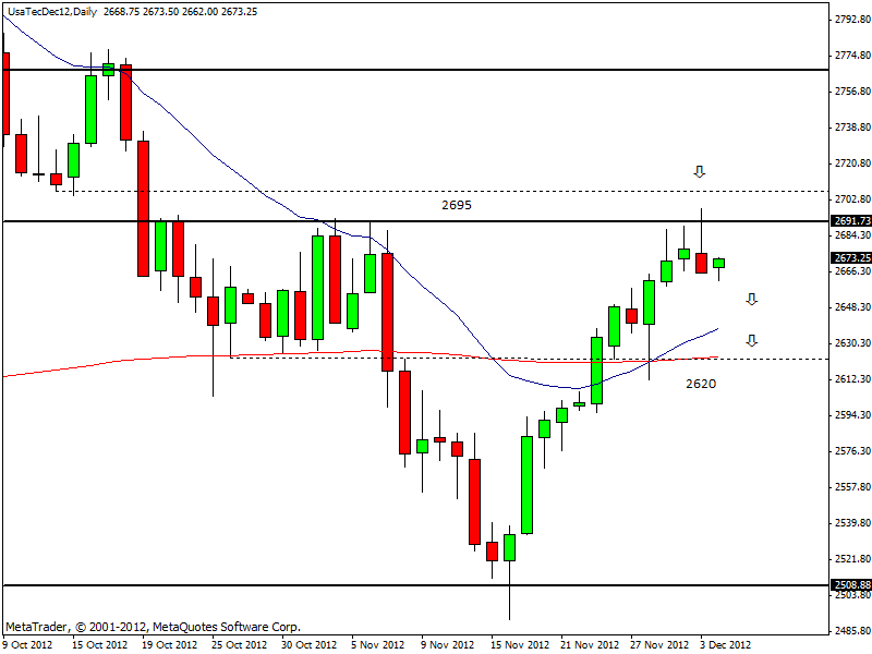 Da un punto di vista operativo, se osserviamo il grafico giornaliero del CFD UsaTecDec12, che replica l’andamento del futures sul Nasdaq, si può notare la formazione di un pattern di inversione del trend proprio su una zona di resistenza giornaliera molto importante compresa tra 2695 e 2700 punti. Potrebbe avvenire un’inversione dei prezzi da qui ai prossimi giorni.