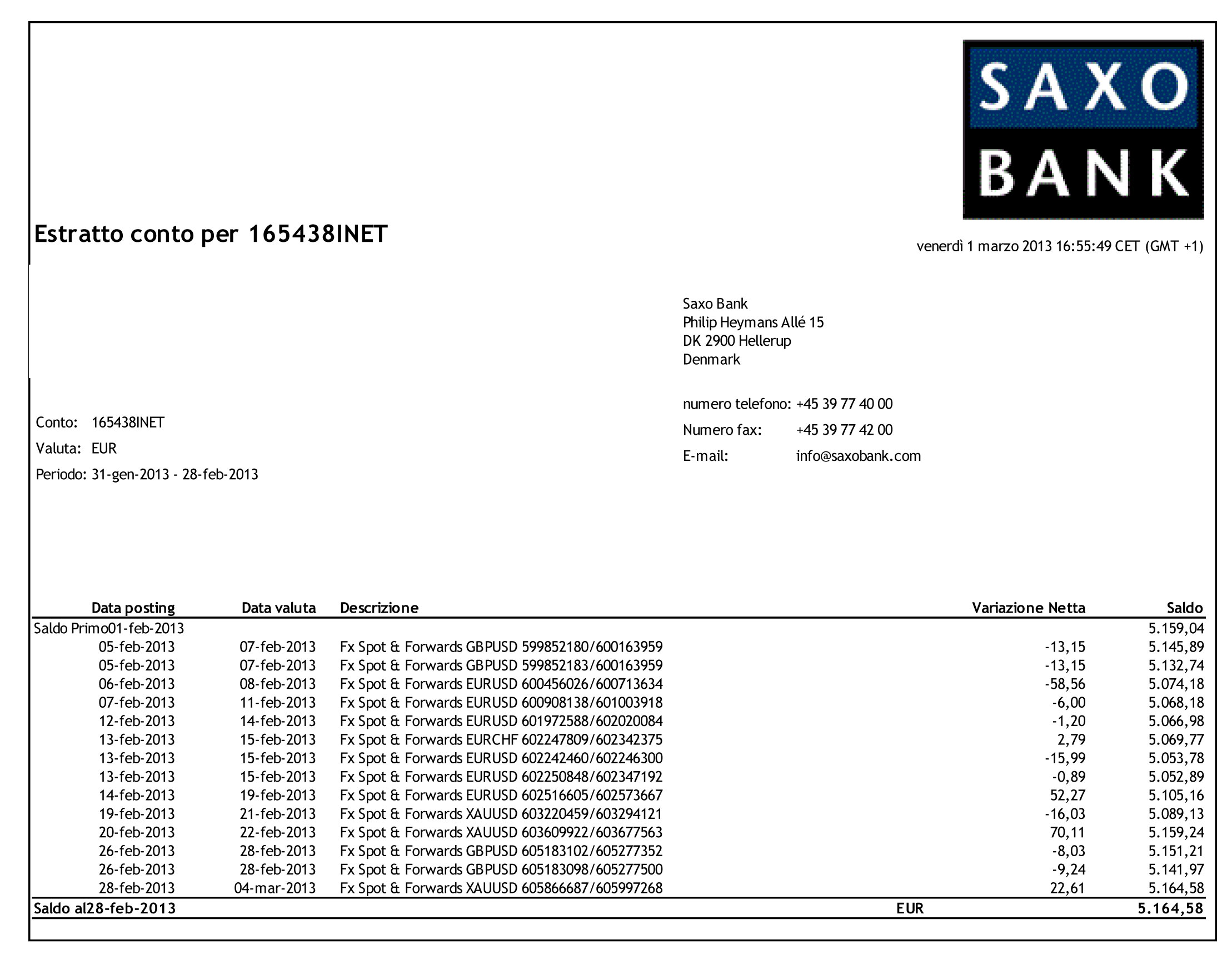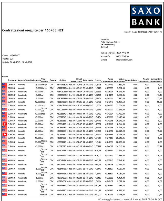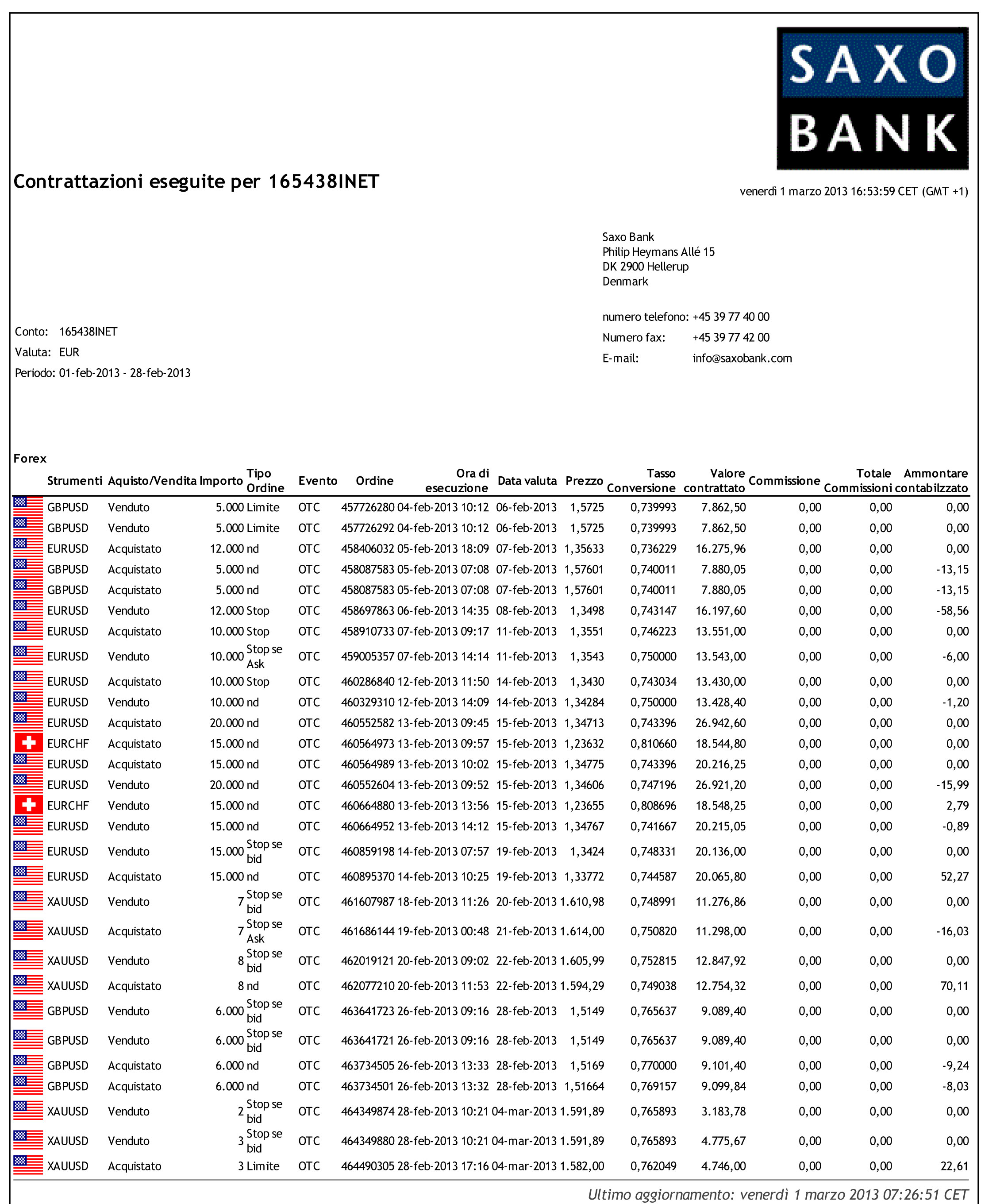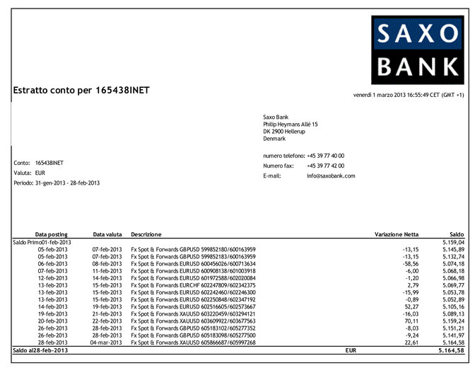 Il dettaglio delle operazioni e l’estratto conto mensile sul conto con denaro reale Saxo Bank ci danno un quadro completo delle performance di febbraio 2013: