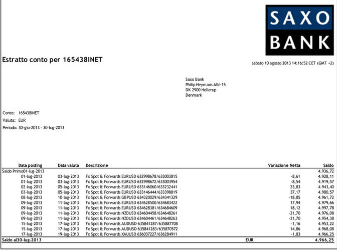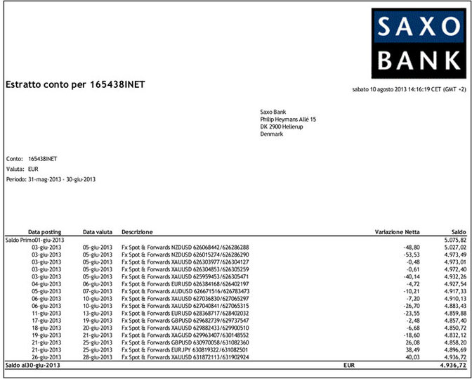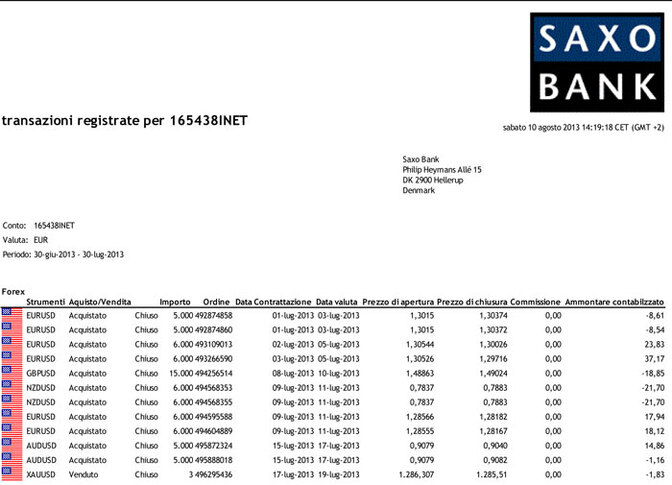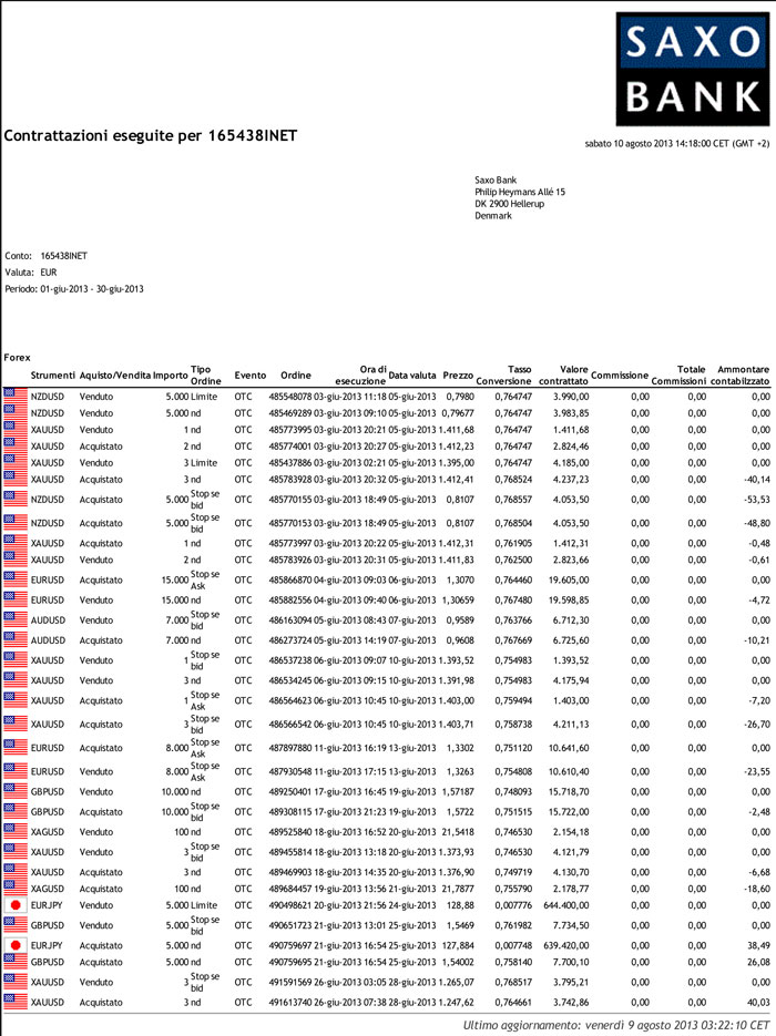 Riportiamo di seguito il report dei risultati economici e del dettaglio operazioni per i mesi di giugno e luglio 2013 per il servizio Segnali di Forex.