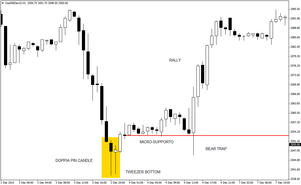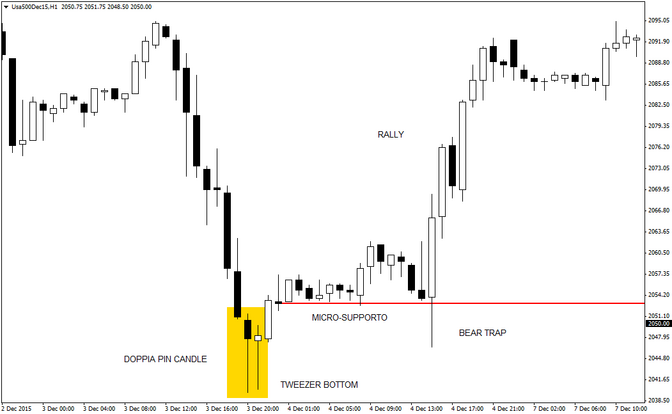 Oggi andiamo ad analizzare un tipico caso in cui i segnali di trading multipli, in un’unica direzione, possono generare opportunità di trading molto ghiotte con un rapporto risk/reward molto accattivante. Il case study odierno è riferito al CFD sull’indice di borsa americano S&P500, analizzato con un grafico intraday a 60 minuti. Dopo un pesante sell-off dei prezzi, si forma una dopia pin candle alla fine del bearish trend con tanto di tweezer bottom (doppio minimo ravvicinato).