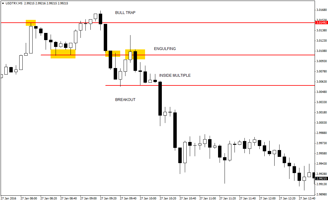 Il chart in alto è su base intraday (a 5 minuti), adatto ad un’attività di scalping o al massimo di day-trading. Mostra inizialmente una Bull Trap sui top di giornata (primo segnale short), poi il breakout ribassista di un micro-supporto e successivamente la comparsa di un bearish engulfing, a seguito del rimbalzo dei prezzi sull’ex supporto poi diventato resistenza. Si tratta di segnali multipli, che confermano più volte lo short sul cambio analizzato.