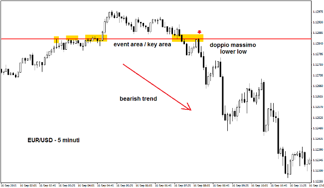 In alto è stato inserito il chart a 5 minuti del tasso di cambio Euro/Dollaro, che a un certo punto effettua il breakout ribassista di un micro-supporto. Questo livello è stato in passato sia resistenza statica che supporto dinamico. Poco dopo avviene il pullback dei prezzi proprio sulla key area. Qui si forma un segnale di trading netto, fornito dal doppio massimo lower low, che nei minuti successivi inizierà a dare i suoi frutti.