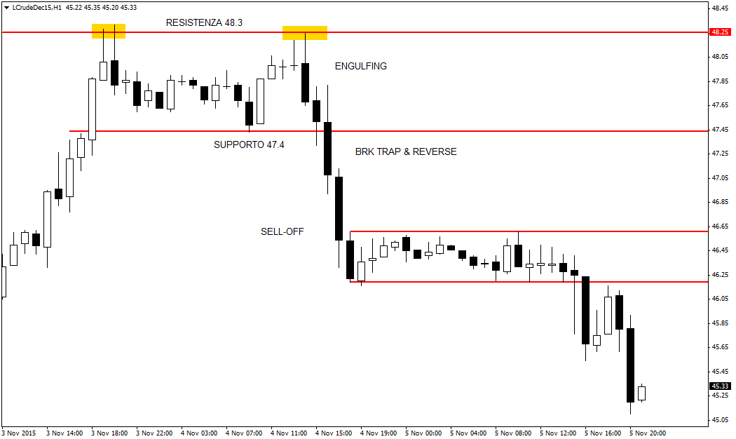La combinazione di segnali di trading, immediatamente successivi tra loro, può essere uno dei modi migliori per mettere a punto operazioni con tasso di successo molto elevato nell’ambito dello swing trading. Il case study odierno mostra la formazione di un netto segnale di inversione ribassista sul grafico a 60 minuti del petrolio Wti, analizzato attraverso il CFD con scadenza dicembre 2015. Si tratta del bearish engulfing, che appare su una fondamentale area chiave di resistenza.