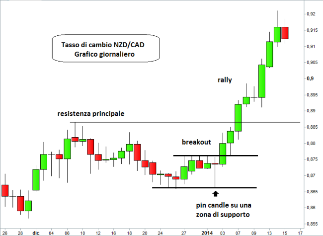 Il grafico in alto sul cross NZD/CAD (dollaro neozelandese su dollaro canadese), time frame giornaliero, mostra un’interessante situazione per questo mercato, dove si susseguono due segnali operativi molto affidabili da un punto di vista statistico. Si tratta della pin candle su una zona di supporto e del breakout di una stretta congestione a bassa volatilità. La presenza della fase di consolidamento poco sotto una resistenza intermedia è un fattore chiave per dare il via a un rally notevole dei prezzi.