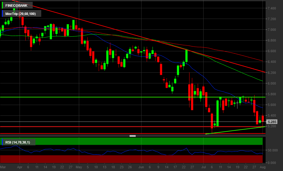 Il titolo ha trascorso la parte centrale di luglio racchiuso in un ristretto range di prezzo, tra €5,6 e €5,7, prima di affondare proprio durante la scorsa settimana fino a minimi segnati durante la mattinata di oggi a €5,2.
