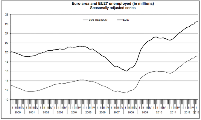 Nel mese di marzo, la disoccupazione nella zona euro ha raggiunto il livello record del 12.1%; in altre parole, circa 19 milioni di cittadini della zona Euro sono senza un posto di lavoro.