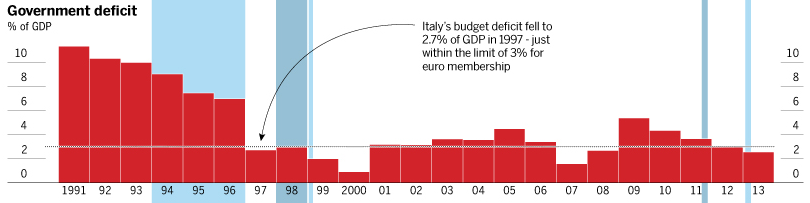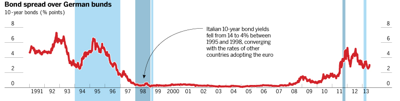Tra il 1995 ed il 1998 l’Italia si giocò la partita dell’Euro. In quello stesso periodo lo spread tra i titoli italiani e quelli tedeschi andò assottigliandosi: il rendimento dei titoli decennali emessi dallo stato Italiano passò dal 14% al 4%.