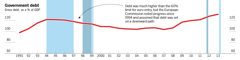 Ma parliamo anche del debito, nello stesso periodo infatti il debito italiano superava il limite del 60%, fissato come soglia massima per l’adesione all’Euro. Ciò nonostante e nonostante la riduzione del deficit fosse accompagnata da una modesta riduzione delle spese pubbliche ed un esiguo aumento degli introiti fiscali, la Commissione Europea ritenne che il debito italiano fosse ormai in una fase di trend ribassista. Nonostante il limite fosse violato, dunque, il debito italiano non avrebbe rappresentato una minaccia per l’Euro e per il paese stesso.