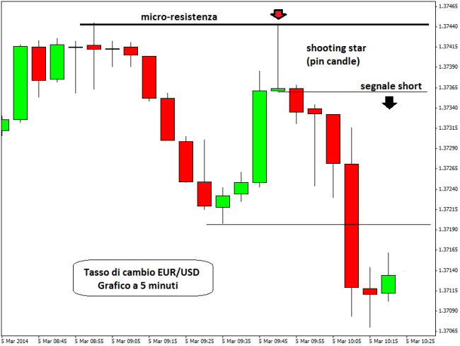 Il real body, invece, è solitamente molto piccolo, anzi quanto più il range è ridotto tanto maggiore sarà l’efficacia ai fini operativi. Per capire meglio questo interessante pattern della candlestick analysis andiamo a visionare un esempio grafico, relativo al tasso di cambio euro/dollaro su base intraday. Dal time frame a 5 minuti in alto si può evincere la presenza di una shooting star su una zona di micro-resistenza (segnale short ancora più affidabile). Una situazione del genere offre al trader l’opportunità di aprire una transazione short, in ottica di scalping, con un buon rapporto rischio/rendimento.