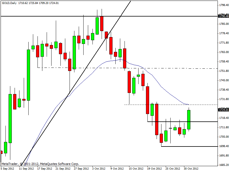 Dopo essere sceso sui minimi da oltre un mese a 1.698$ l’oncia, l’oro ha ripreso la strada del rialzo a seguito di un breakout avvenuto oggi (e anciticipato nel servizio di segnali su Forex e CFD su www.segnalidiforex.it) dopo una fase di consolidamento sui bottom di periodo. L’oro è salito sui massimi a sette giorni a 1.725,8$ l’oncia. Il prossimo target è 1.730$. Poi, dopo un fisiologico pullback, ci si può aspettare un nuovo allungo verso 1.750$ l’oncia.