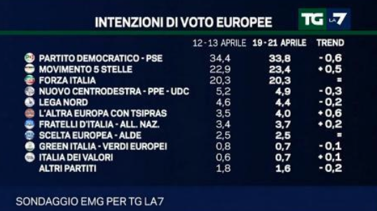 A circa un mese dalle elezioni europee del 25 maggio, si fanno più frenetiche le previsioni e i sondaggi circa le intenzioni di voto degli italiani. Questa settimana presentiamo il sondaggio svolto da Emg per il Tg di Enrico Mentana su La7. Secondo le rilevazioni di Emg, negli ultimi giorni, il Pd ha perso qualche decimo percentuale, a favore probabilmente del Movimento 5 Stelle che registra invece un miglioramento.