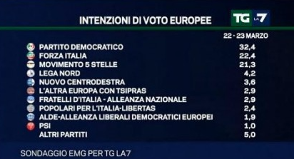 Secondo un nuovo sondaggio svolto da Emg per Tg La7 i partiti che si aggiudicheranno il maggior numero di seggi sono il Pd, Forza Italia e il Movimento 5 Stelle. Incerto l’ingresso della Lega nord nel parlamento europeo a causa della soglia di sbarramento. Fuori tutti gli altri.