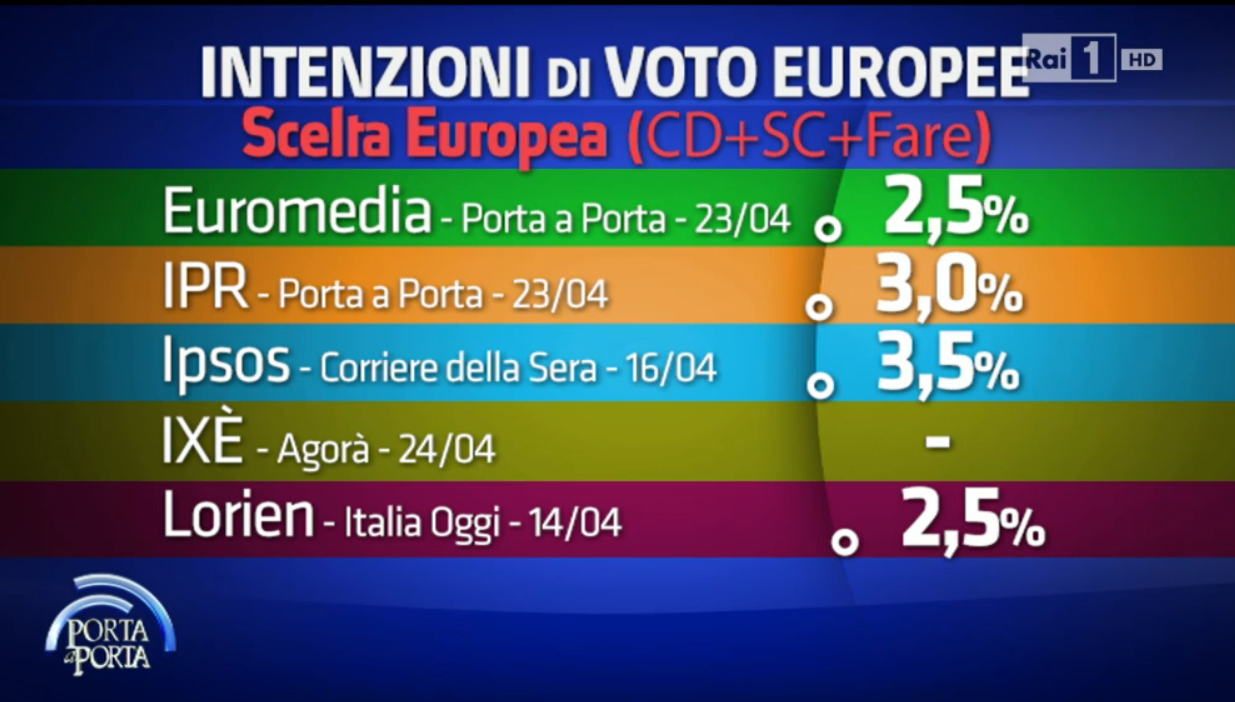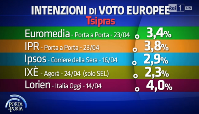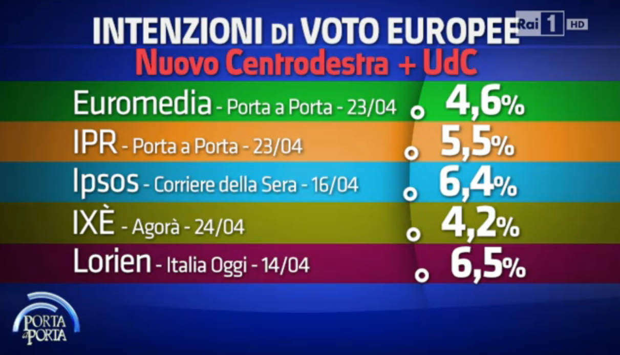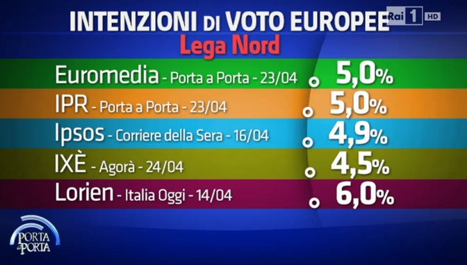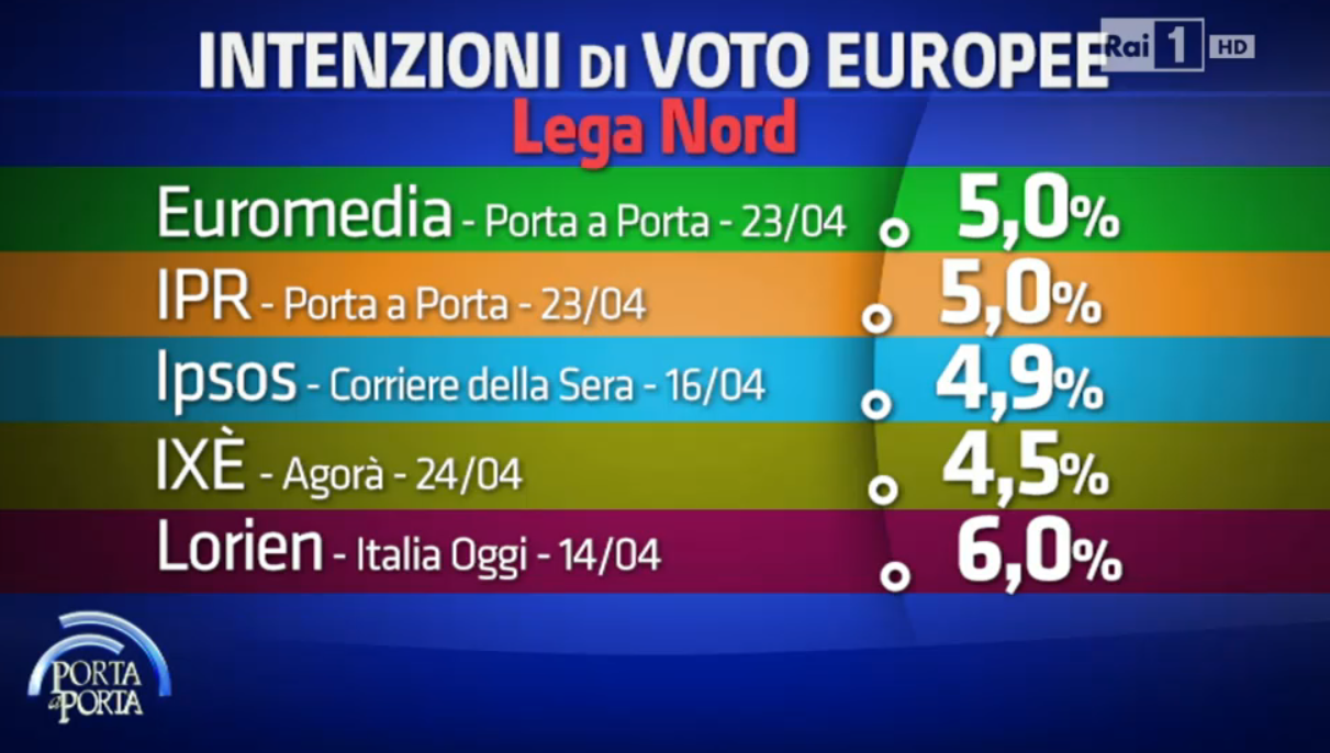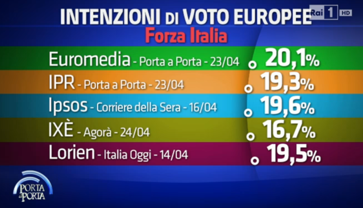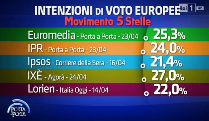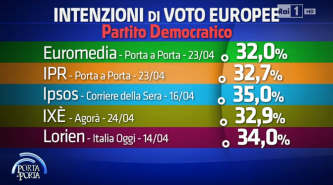 Nelle ultime settimane i sondaggi per le elezioni europee si fanno sempre più intensi e le discussioni dei partiti politici corrono sul filo dei decimi percentuali. Nella puntata di ieri sera del programma Porta a Porta sono stati presentati i risultati di questa settimana dei principali sondaggi dei vari istituti: Euromedia, IPR, Ipsos, Ixè e Lorien.