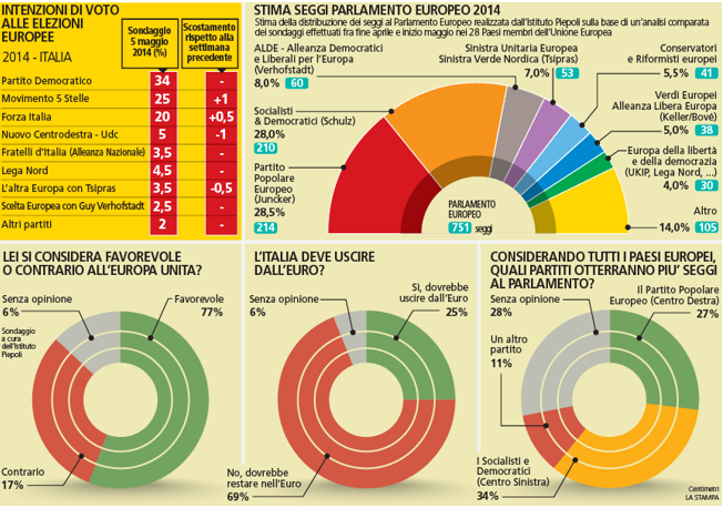 L’ultimo sondaggio in ordine di tempo sulle elezioni europee che si terranno il prossimo 25 maggio arriva dall’istituto Piepoli per il quotidiano La Stampa.