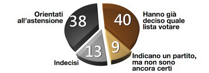 Secondo le ultime rilevazioni infatti, soltanto 4 italiani su 10 hanno già deciso quale lista votare; il 9% indica un partito, ammettendo però che potrebbe cambiare idea. Il 13% è del tutto indeciso, mentre 38 elettori su 100 tendono verso l’astensione.