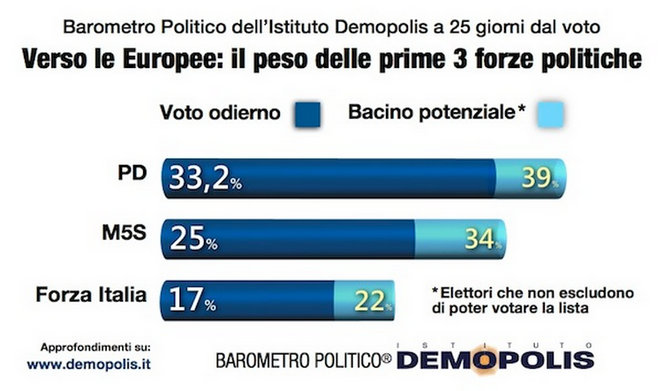 "Mentre sembrano per il momento limitati gli effetti del ritorno in tv di Berlusconi, con Forza Italia che resta posizionata intorno al 17%, il voto del 25 maggio - afferma il direttore di Demopolis Pietro Vento - si profila sempre di più come una sfida elettorale tra Renzi e Grillo. Se si votasse oggi, il PD otterrebbe il 33,2%, il Movimento 5 stelle il 25%. Ma entrambe le liste, in un mercato elettorale oggi molto mobile, possono contare su un bacino potenziale più ampio, che raggiunge il 39% per il partito di Renzi ed il 34% per il Movimento di Grillo".