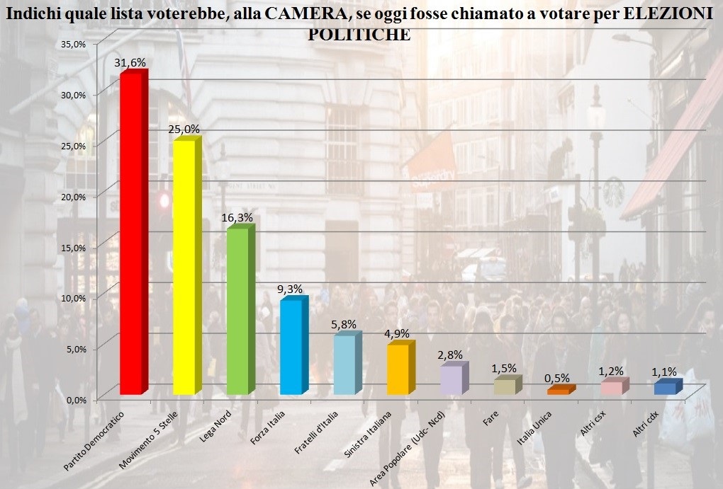 In seconda posizione troviamo il M5S che con il 25 % dei consensi si conferma stabile in seconda posizione, terza classificata la Lega Nord al 16,3% davanti a Forza Italia al 9,3% e Fratelli d’Italia al 5,8%.