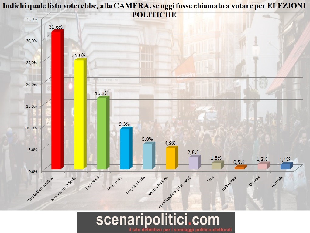 Dagli ultimi sondaggi politici di “Scenari politici” vediamo come sia sempre il Partito Democratico a dominare la classifica delle preferenze, dove la maggior parte degli intervistati alla domanda: “Indichi quale lista voterebbe alla Camera se oggi fosse chiamato a votare per le elezioni politiche” risponde per un 21,6% a favore del partito di Matteo Renzi.