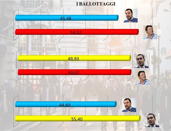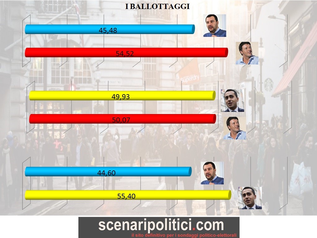 Molto interessanti sono stati i dati riguardanti gli eventuali ballottaggi, nei quali sono state immaginate le sfide possibili fra tre candidati Premier: Matteo Renzi, Matteo Salvini e Luigi Di Maio; andiamo a vedere nel dettaglio quindi quanto è emerso dai sondaggi di Scenari Politici.