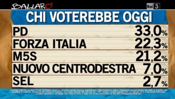 Arrivano i primi sondaggi politici del 2014 e i risultati confermano l’andamento di fine anno passato. Primo in classifica nelle preferenze degli italiani, con il 33% si conferma il Partito democratico di Enrico Letta, o forse sarebbe meglio dire di Matteo Renzi, seguito da Forza Italia, staccato di quasi dieci punti percentuali.
