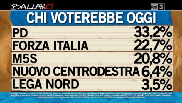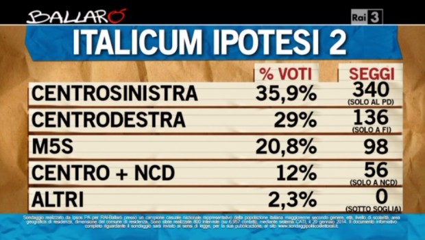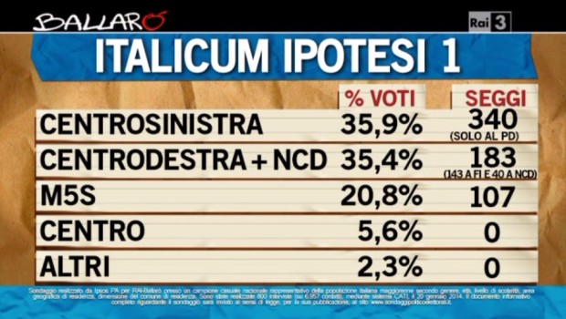 I sondaggi effettuati da Ipsos per Ballarò si concentrano soprattutto sugli scenari politici derivanti dall’Italicum voluto dall’accordo Renzi - Berlusconi, formulando una doppia ipotesi.