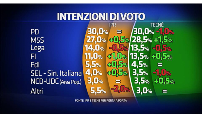 I sondaggi politici condotti da Tecnè, invece, hanno una visione leggermente differente sulle intenzioni di voto per il PD. Infatti, questi hanno rilevato un calo dell’1% per il partito di Renzi, ma concordano con IPR sulla percentuale di voti: 30%.