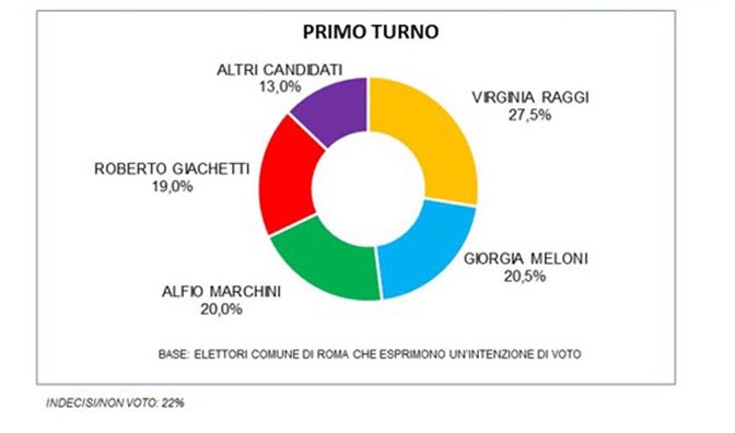 A Roma c’è una situazione molto confusa e non c’è un candidato nettamente favorito. Al momento, l’unica certa di arrivare al ballottaggio sembra essere Virginia Raggi del Movimento 5 Stelle che secondo Piepoli dovrebbe ottenere il 27% dei voti.