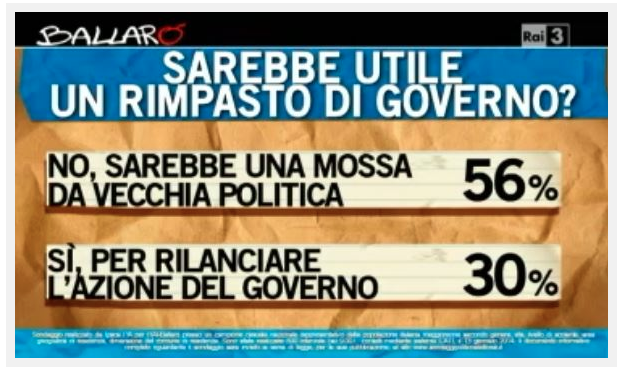 L’istituto ha chiesto ai cittadini se fossero d’accordo con un rimpasto di governo visto le polemiche che hanno travolto alcuni dei ministri in carica. Il 56% degli intervistati ha detto NO al rimpasto del governo ritenendolo una mossa da vecchia politica utile a ridistribuire poltrone, ma non a fare il bene dei cittadini. Al contrario il 30% pensa che sarebbe il modo migliore per rilanciare l’operatore del governo.