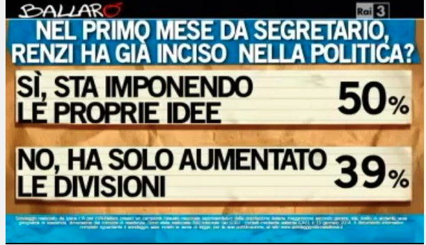 Nella puntata di ieri sera del programma televisivo Ballarò, Nando Pagnoncelli ha presentato i risultati del sondaggio Ipsos fatto per la trasmissione del martedì sera.