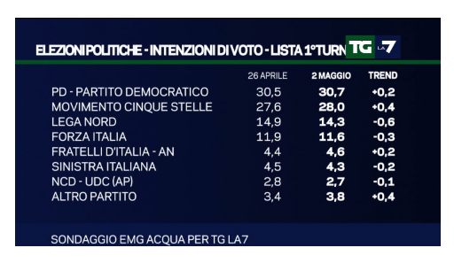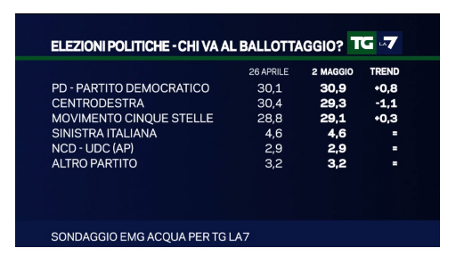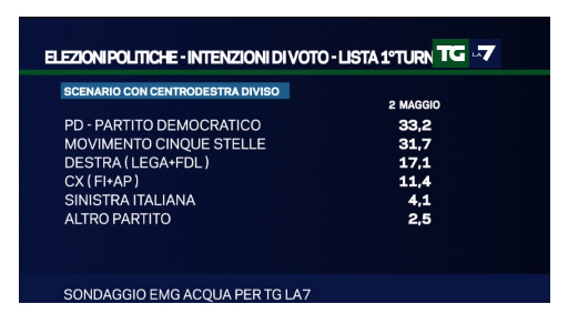 Intanto, per vedere lo stato di forma con cui i principali partiti politici si presenteranno alle prossime elezioni amministrative del 5 giugno, analizziamo nel dettaglio tutti i risultati dei sondaggi elettorali condotti da Emg Acqua e andati in onda nel corso del TG La7.