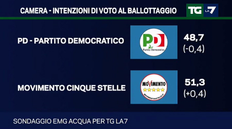 In questo caso, per i sondaggi politici elettorali sarebbero il PD e il Movimento 5 Stelle ad andare al ballottaggio, nonostante il partito di Renzi sia in calo dello 0,3% e i pentastellati dello 0,1%.