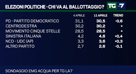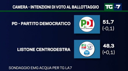 Ma vediamo nel dettaglio quanto rilevato dagli ultimi sondaggi politici elettorali EMG Acqua andati in onda durante il TG La7.