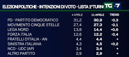 Infatti, secondo i sondaggi politici dell’istituto EMG Acqua per il TG La7, il PD questa settimana perde lo 0,6%, ma resta in prima posizione con il 30,5%. Il dato è allarmante, perché è la percentuale più bassa registrata dal PD dalle elezioni europee del 2014.