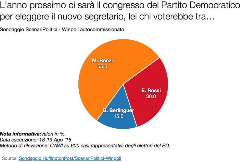 Il premier ha ottenuto un ottimo 55% di preferenze, Rossi un discreto 30% e la Berlinguer un 15% senza infamia e senza lode.