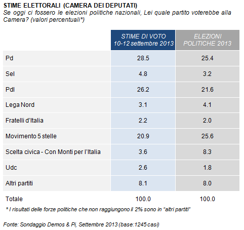 E il PDL? Zavorrato dalla “questione decadenza” il partito di Berlusconi perde terreno sugli avversari, rimanendo fermo a quel 26,2% che attualmente gli farebbe perdere la tanto agognata maggioranza alla Camera.