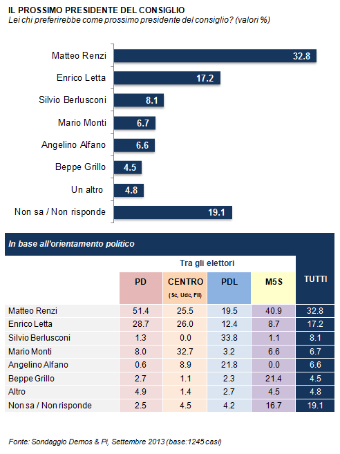 Per quanto riguarda le preferenze espresse dagli intervistati vince nuovamente, nettamente e senza appello, Matteo Renzi. Il 32,8% degli italiani lo indica come prossimo Premier. A quanto pare il sindaco di Firenze è riuscito a conquistare il cuore dei cittadini, che di settimana in settimana, continuano a vederlo come il candidato ideale alla presidenza.