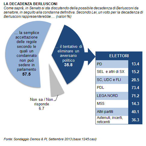 Alla domanda su cosa rappresenta il voto per la decadenza di Silvio Berlusconi il 57,5% degli intervistati risponde che non sarebbe altro che l’applicazione di una legge che impedisce ad un condannato di sedere in Parlamento, mentre il 35,8% la vede solo come un tentativo di eliminare dal mondo politico un avversario vincente e temuto.