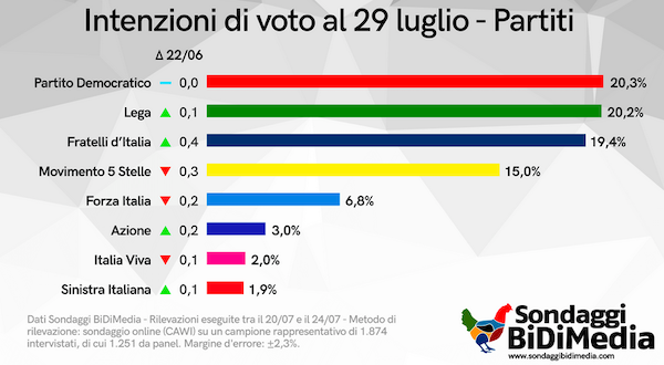Il Partito Democratico sarebbe il primo partito del Paese, ma l’ultimo sondaggio politico di Bidimedia, diramato in data 29 luglio, sorride comunque al centrodestra che in caso di elezioni vincerebbe a mani basse.