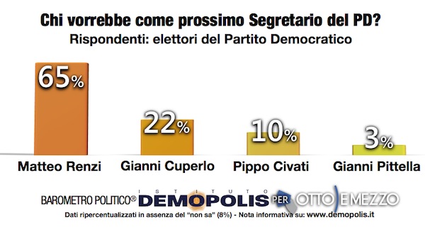 Secondo i dati Demopolis Matteo Renzi sarebbe il super favorito per la segreteria con più del 65% dei voti. Dopo Renzi, in ordine decrescente, Cuperlo, Civati e Pittella. Altro dato significativo che emerge dal sondaggio Demopolis è che soltanto il 15% degli elettori del Pd ha intenzione di andare a votare per l’elezione del segretario del partito.
