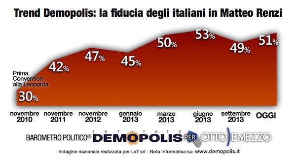 Altro dato emerso dal sondaggio Demopolis l’aumento del gradimento di Renzi, da parte degli elettori del centrosinistra negli ultimi anni. Demopolis ha analizzato il gradimento di Renzi negli ultimi tre anni: a fine 2010 godeva del 30% di fiducia, oggi è in crescita oltre il 50%.