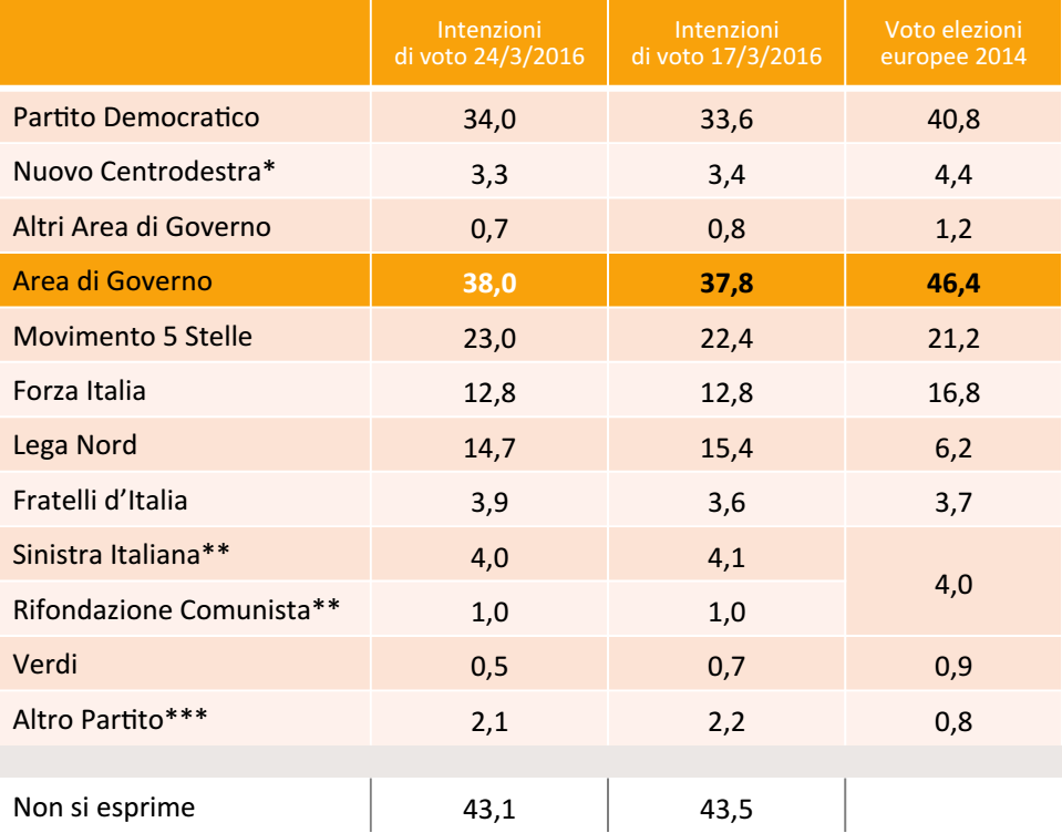 Il dato del 34% sembra non discostarsi molto da quelli Winpoll del 22 marzo che davano il PD al 32,9%.