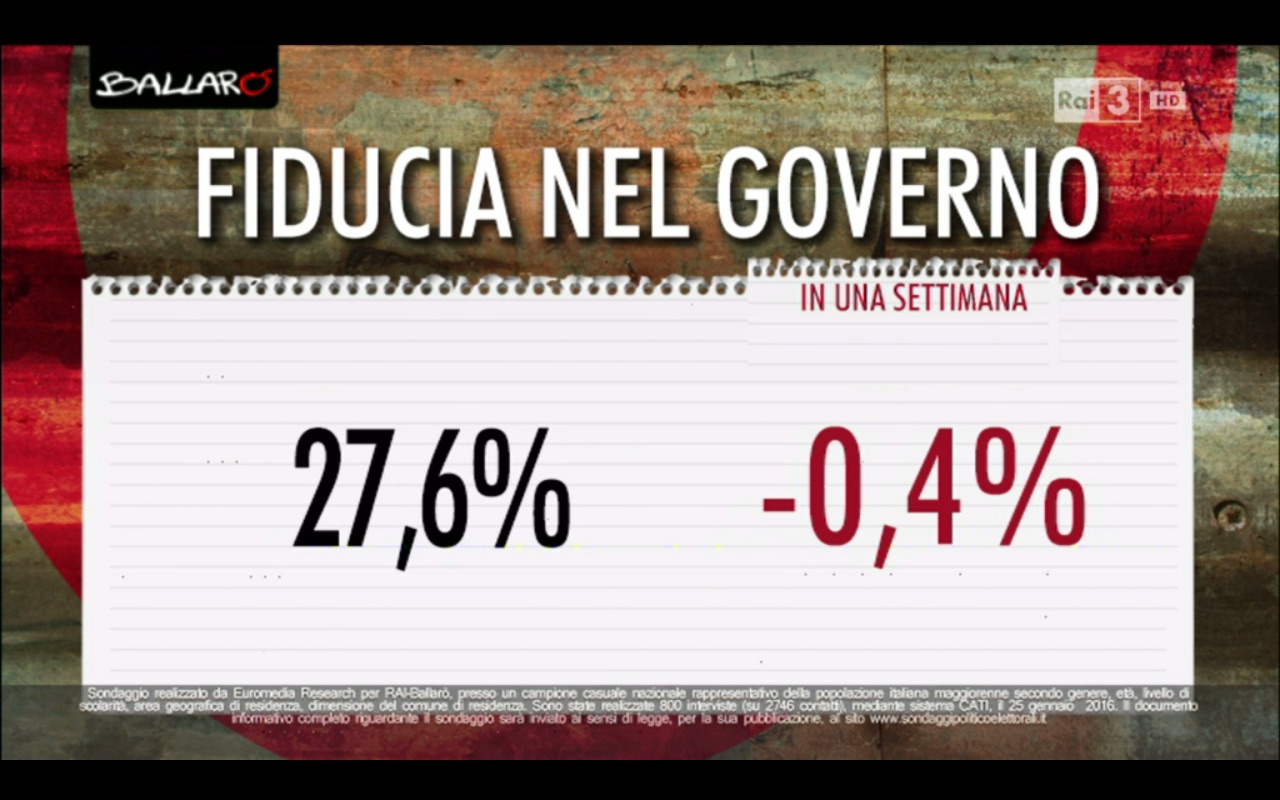 Ma i dati peggiori sono quelli della fiducia in Matteo Renzi e nel suo governo, ai minimi storici. Gli ultimi sondaggi di Euromedia trasmessi da Ballarò la attestano al 27,6% con un calo dello 0,4% facendo registrare una contrazione, che seppur non particolarmente significativa, fa presagire un periodo di forti malumori in casa Dem.