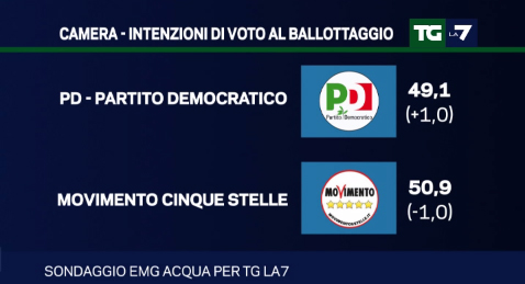 Non cambia però il risultato finale; infatti, come rilevato dagli ultimi sondaggi politici, se si votasse oggi sarebbe il Movimento 5 Stelle ad andare al Governo, a meno che il centrodestra non risani la frattura tra la Lega Nord e Forza Italia e decida di presentarsi unito.