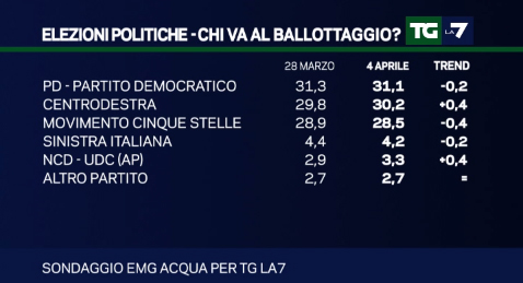C’era molta attesa per i sondaggi politici EMG Acqua andati in onda nell’ultima puntata del TG La7, perché c’era la curiosità di sapere come sarebbero cambiate le intenzioni di voto degli italiani dopo lo scandalo del ministro Guidi.