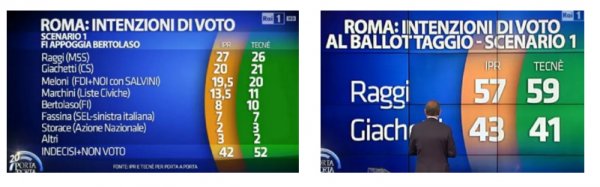 - a Roma la Meloni e Bertolaso rischiano di restare fuori dal ballottaggio, scavalcati da Giachetti (PD) e da Virginia Raggi;