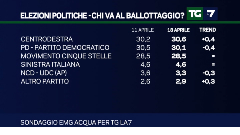 Nella giornata di ieri non c’è stato il consueto appuntamento con i sondaggi politici Emg Acqua per il TG La7, probabilmente vista la ricorrenza del 71° anniversario della Liberazione d’Italia. Quindi, non possiamo analizzare le intenzioni di voto degli italiani, poiché non disponiamo di sondaggi politici elettorali aggiornati ad oggi.