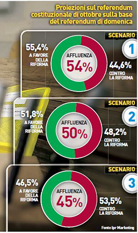 Nel dettaglio, se si votasse oggi, e l’affluenza fosse di circa il 54%, il SI vincerebbe con il 55,4% dei voti a favore. Renzi però deve sperare che molti italiani vadano a votare, perché in caso di affluenza del 45% sarebbe il NO a vincere con il 53,5%.