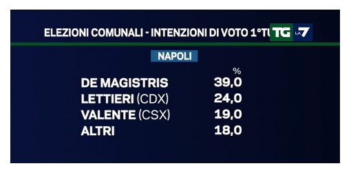 - Elezioni di Napoli 2016: secondo i sondaggi Emg, il sindaco uscente De Magistris non ha avversari. Infatti, De Magistris al primo turno dovrebbe ottenere il 39% (Lettieri del Centrodestra il 24%) per poi trionfare al ballottaggio con il 64% delle preferenze.