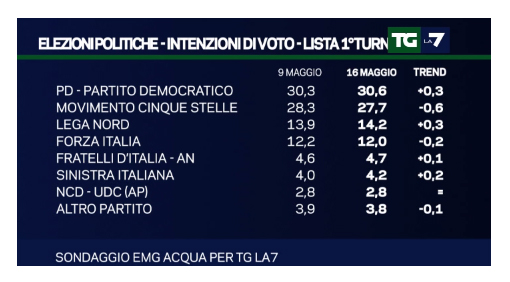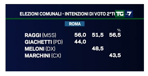 Secondo i sondaggi politici Emg Acqua, il Centrodestra riuscirebbe ad andare al ballottaggio con il Partito Democratico, mentre il Movimento 5 Stelle ne resterebbe fuori.